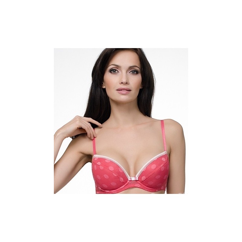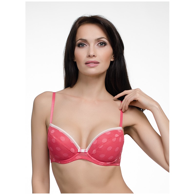 Бюстгальтер "Пуш-ап" из эластичного трикотажного полотна. На каркасах. Чашки на дубляже с хлопком, с объёмными вкладышами. Отделка - контрастная эластичная тесьма по верхнему срезу чашек и бантик.