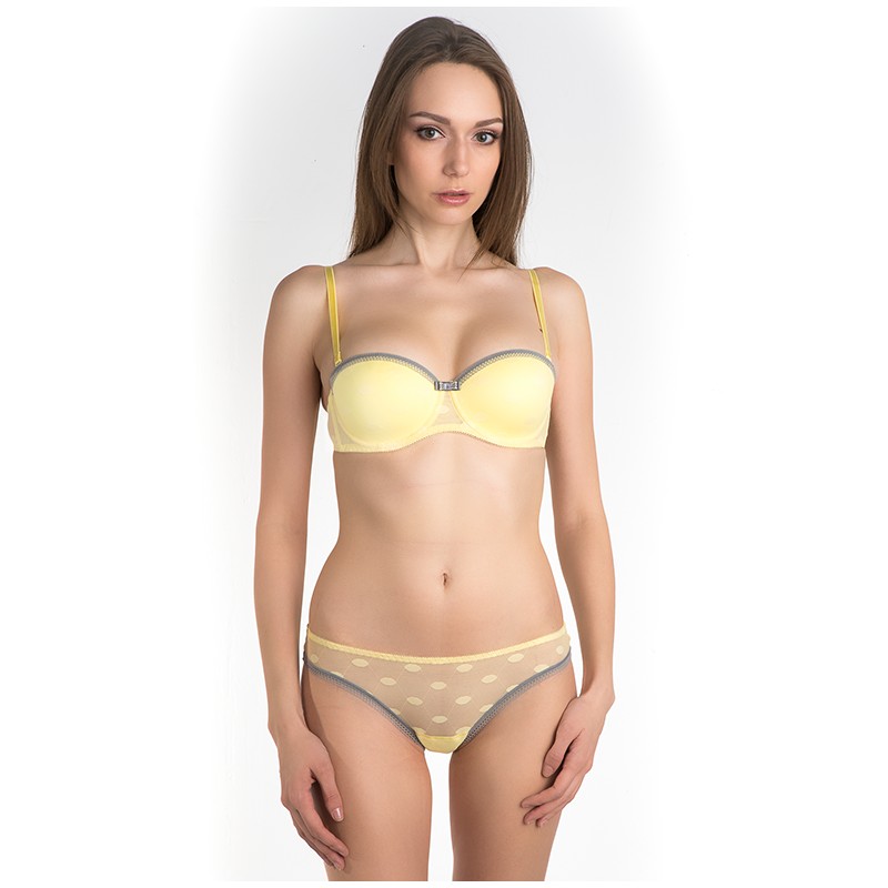 Бюстгальтер "Балконет" из эластичного трикотажного кружевного полотна. На каркасах. Жесткие формованные чашки. Съемные бретели.Упругие пластины в боковых деталях стана. Отделка - контрастная эластичная тесьма по верхнему срезу чашек и бантик.