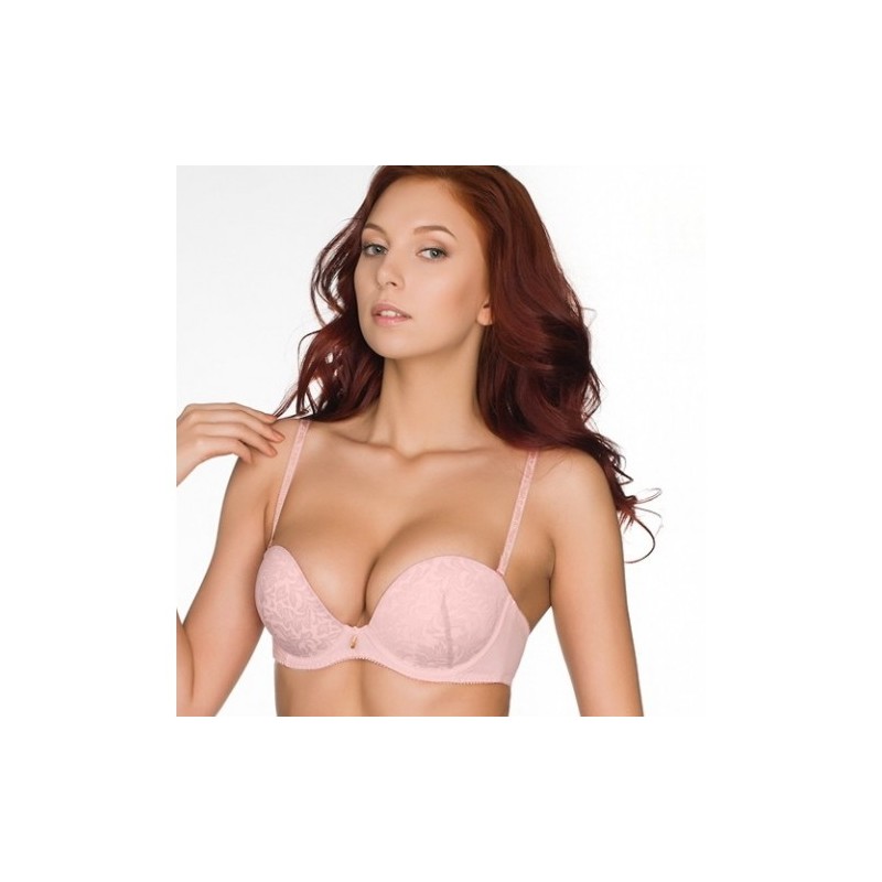 Бюстгальтер балконет с эффектом пуш-ап из эластичного трикотажного полотна и эластичного кружевного полотна. На косточах. Жёсткие формованные чашки. Съёмные бретели. Упругие платины в боковых деталях стана. Отделка - украшение в виде декоративной подвески "под золото". Серия Акцент.
