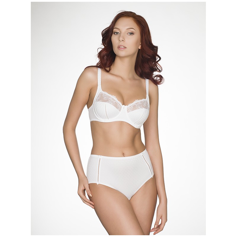 Бюстгалтер из эластичного трикотажного жаккардового полотна и неэластичной вышивки, на каркасах. Мягкие чашки с боковой корректирующей деталью. Нижние детали чашек из ламинированного полотна. Отделка - атласные бантики и декоративный шов "мережка" на нижних деталях чашек.