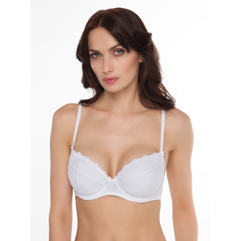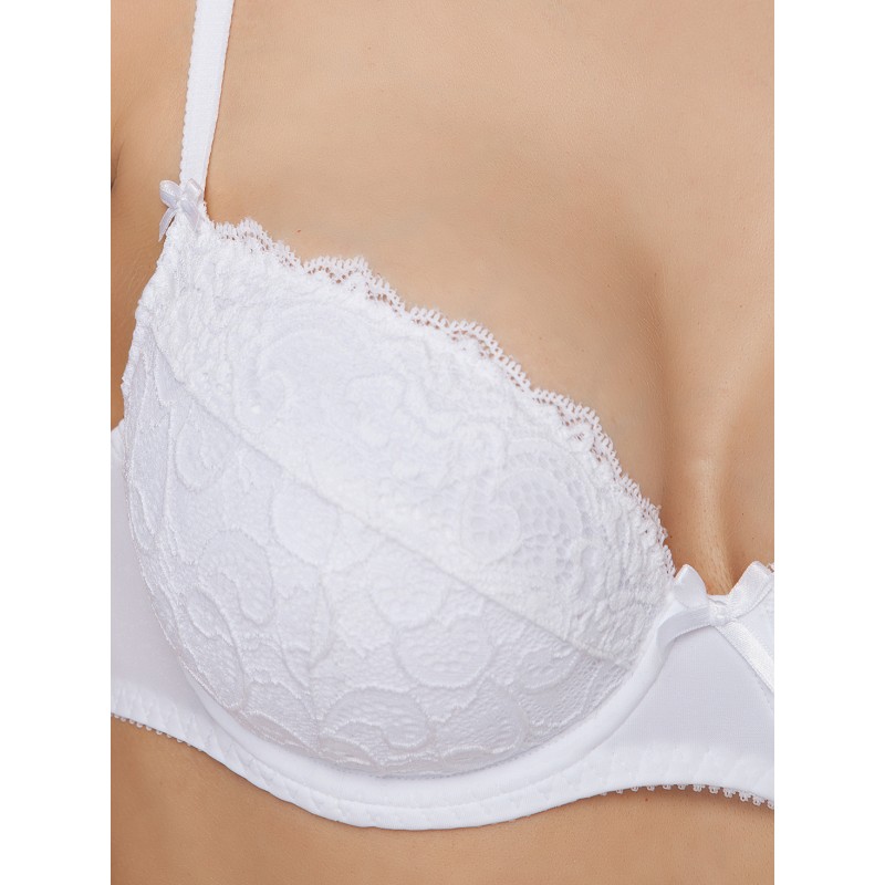 Бюстгальтер "пуш-ап" из эластичного кружевного полотна, эластичного кружева и эластичного трикотажного полотна. На каркасах. Чашки на дубляже с хлопком, с обьемными вкладышами. Отделка - атласные бантики.