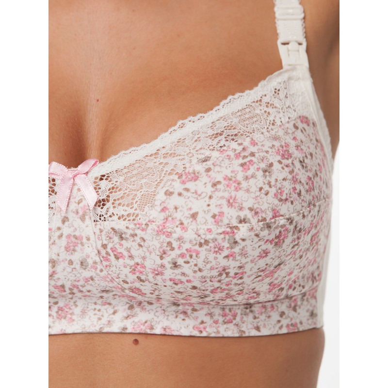 Бюстгальтер для кормящей матери из эластичного кружева, неэластичного набивного трикотажного хлопкового полотна , набивного ламинированного хлопкового полотна и эластичного трикотажного полотна. Без каркасов. Мягкие отстёгивающиеся чашки на подкладке из неэластичного набивного трикотажного хлопкового полотна. Чашки с боковой корректирующей деталью из ламинированного хлопкового полотна. Отделка бантик.